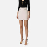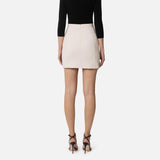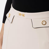 Gonna realizzata in tessuto crepe stretch impreziosita da morsetto gioiello con logo smaltato sul fascione, dettagli di piping a contrasto e bottoni con ghiera in metallo dorato, patte con bottoni, zip invisibile.