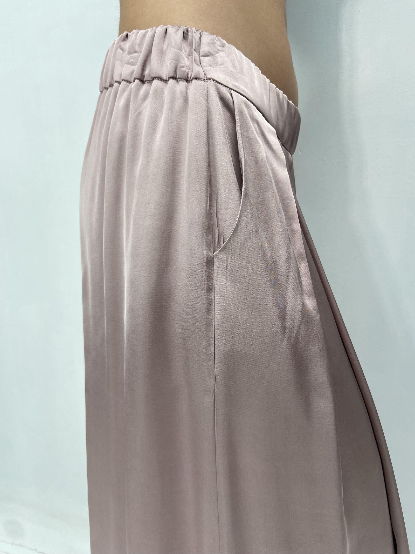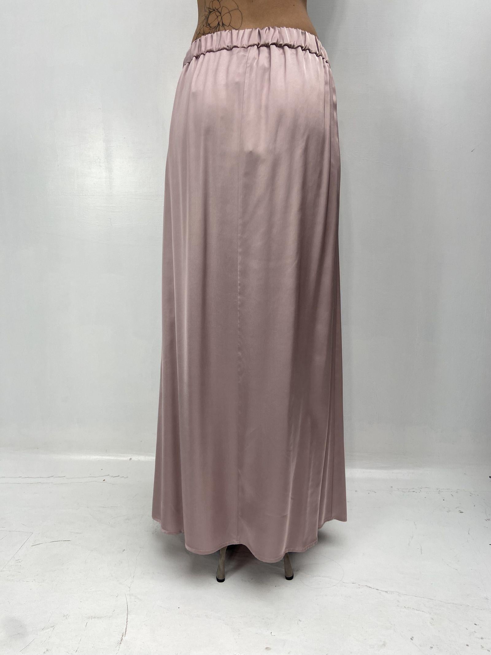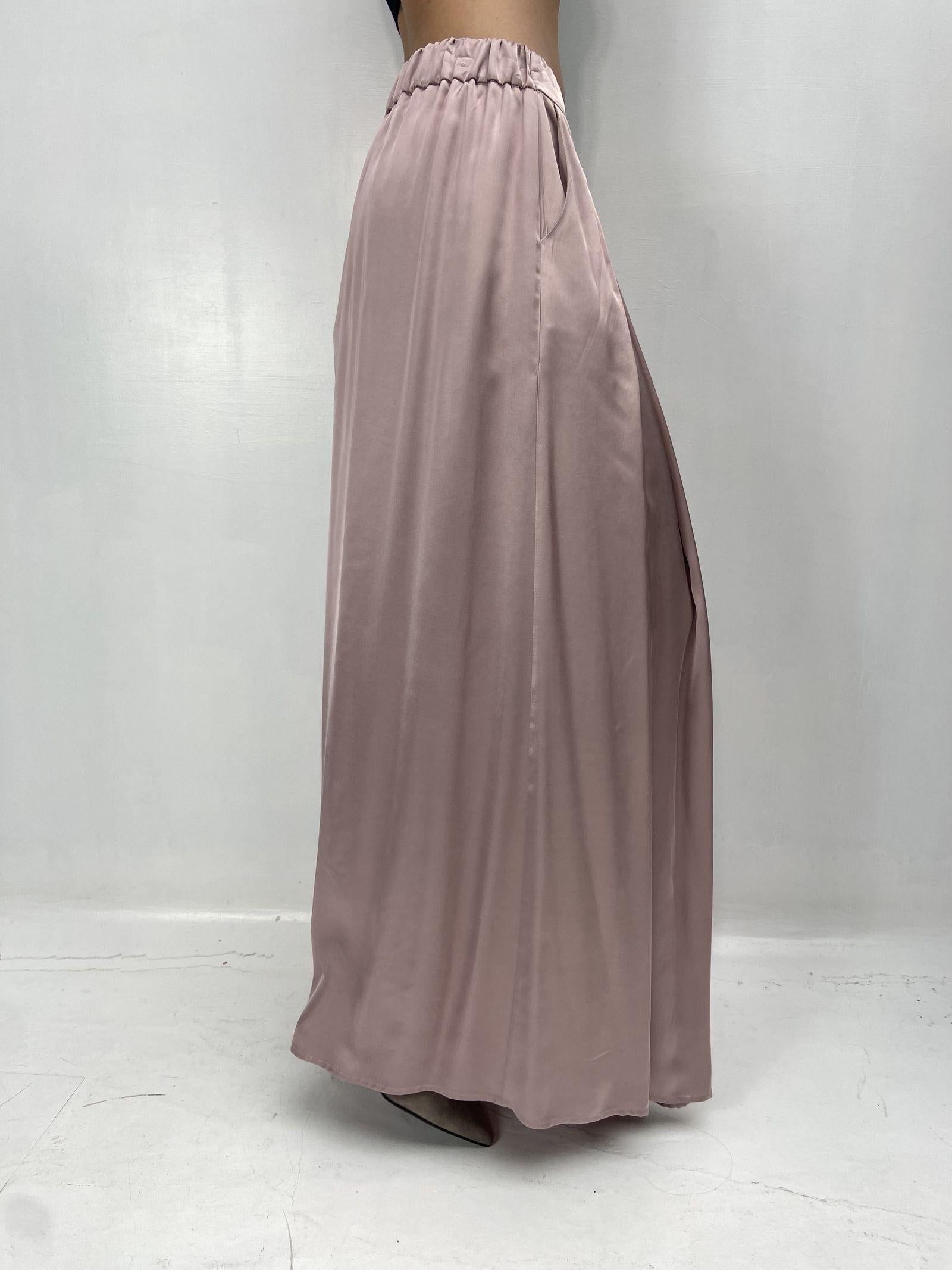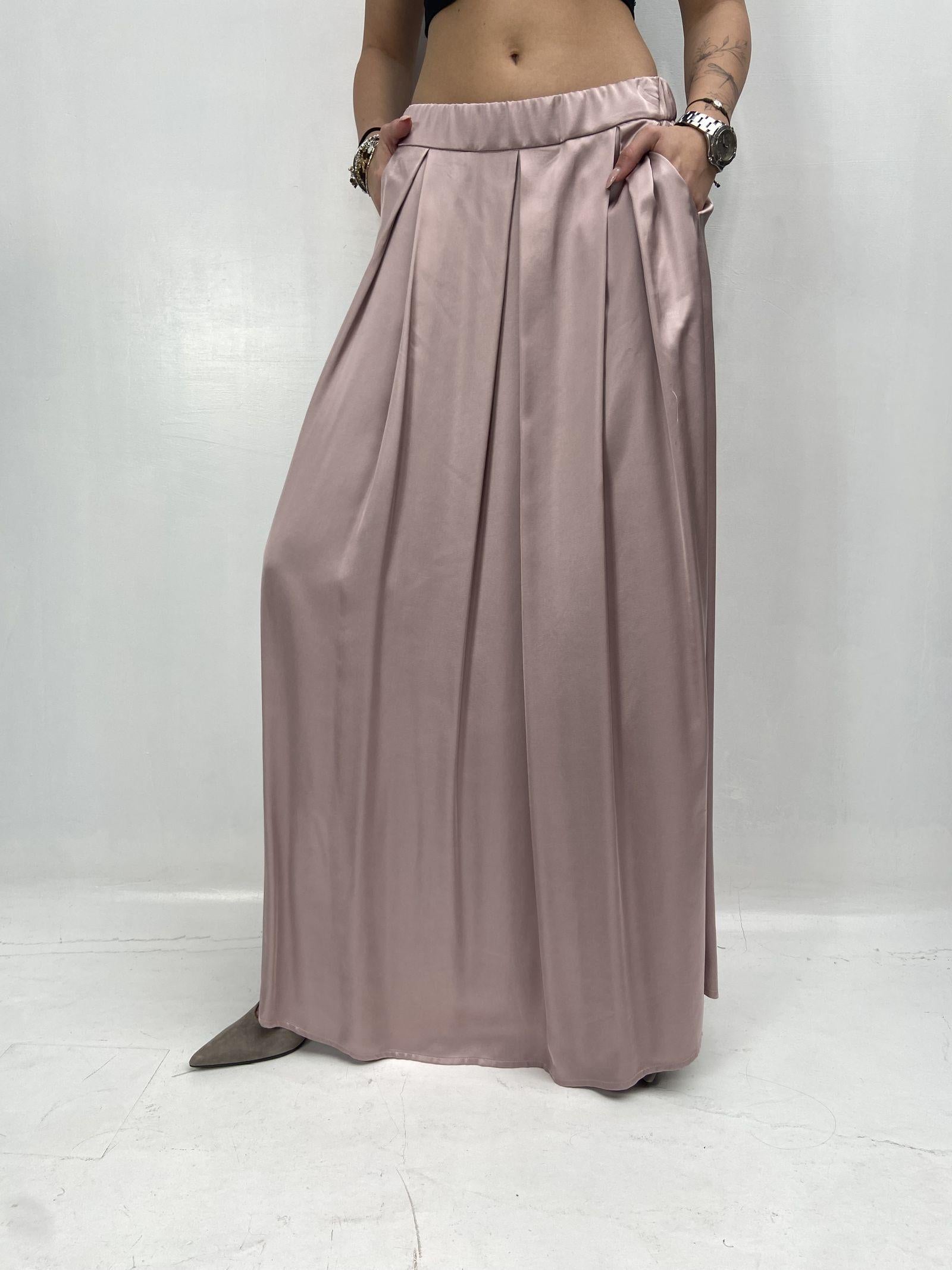 Gonna lunga in raso dal design essenziale e raffinato, pensata per un’eleganza naturale e contemporanea. Il tessuto fluido e luminoso scivola delicatamente lungo la figura, creando un effetto leggero e armonioso. La vita con elastico garantisce comfort e una vestibilità adattabile, mentre le pieghe frontali aggiungono movimento e femminilità. Completano il modello le pratiche tasche laterali, dettaglio funzionale che ne esalta lo stile disinvolto e moderno. Un capo versatile, perfetto per look quotidiani o occasioni più ricercate.
