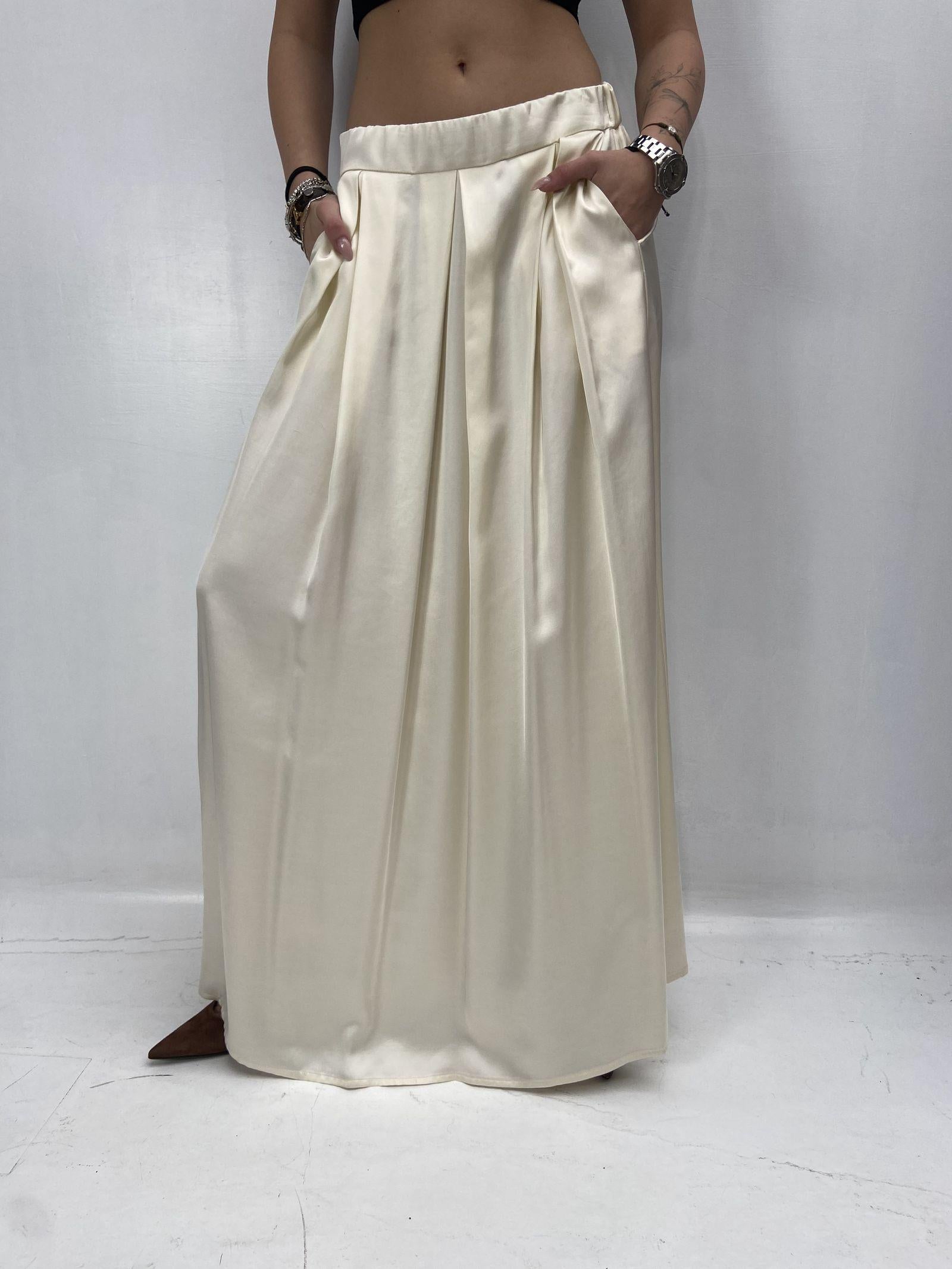 Gonna lunga in raso dal design essenziale e raffinato, pensata per uneleganza naturale e contemporanea. Il tessuto fluido e luminoso scivola delicatamente lungo la figura, creando un effetto leggero e armonioso. La vita con elastico garantisce comfort e una vestibilità adattabile, mentre le pieghe frontali aggiungono movimento e femminilità. Completano il modello le pratiche tasche laterali, dettaglio funzionale che ne esalta lo stile disinvolto e moderno. Un capo versatile, perfetto per look quotidiani o occasioni più ricercate.