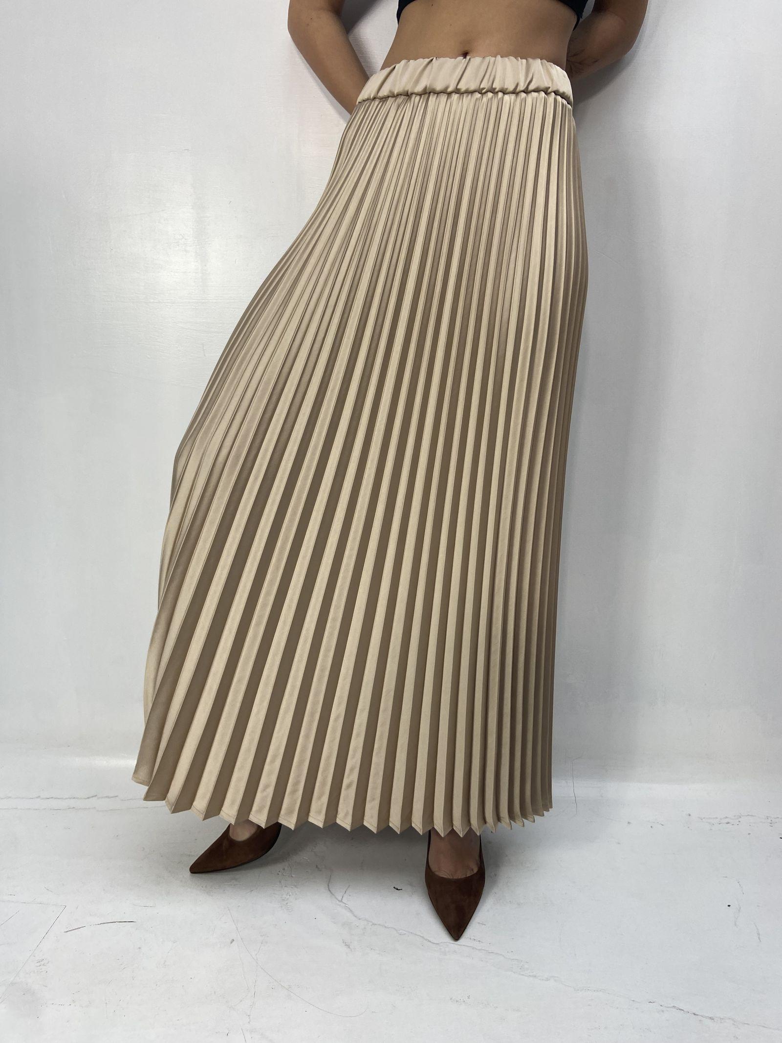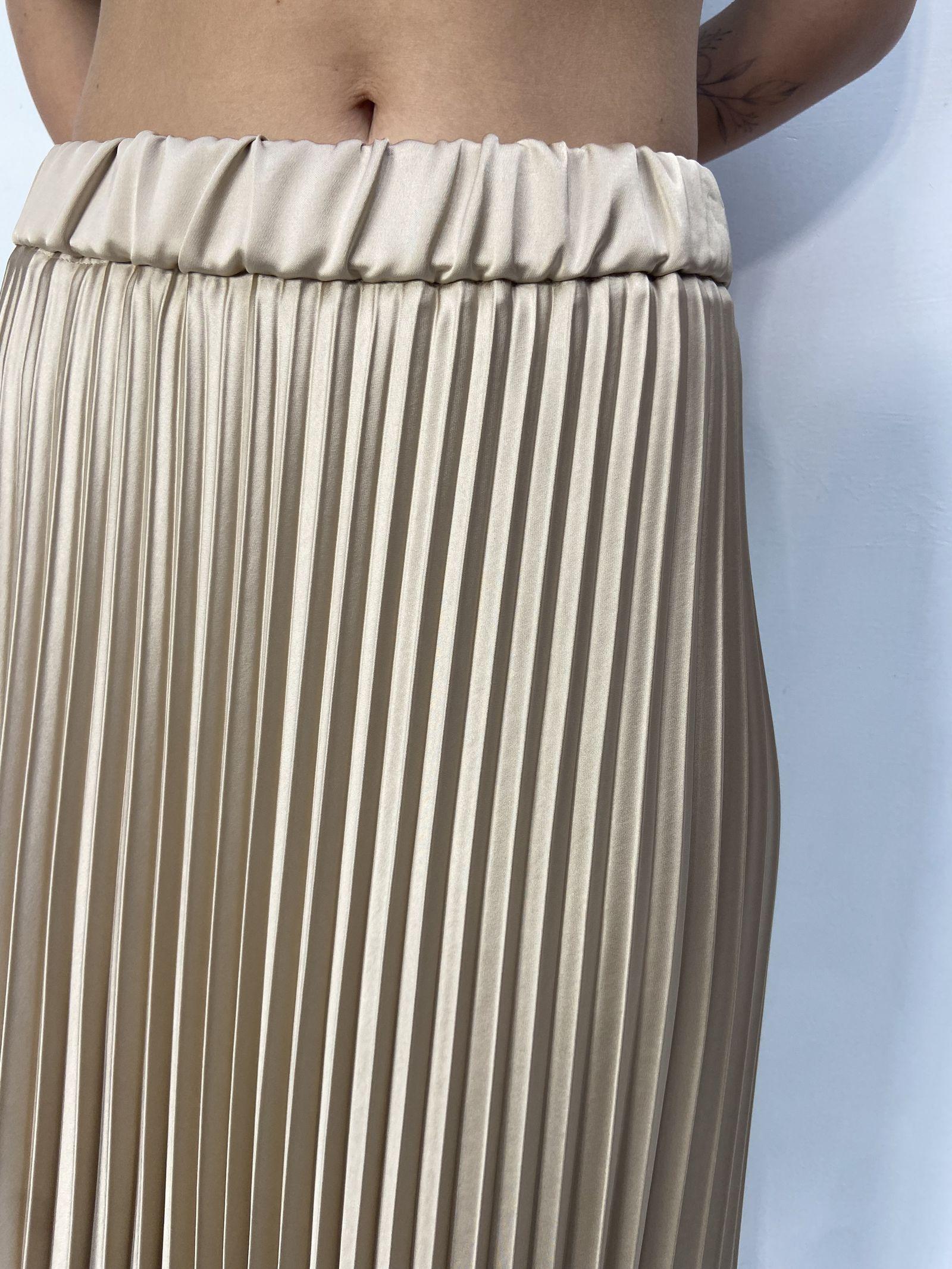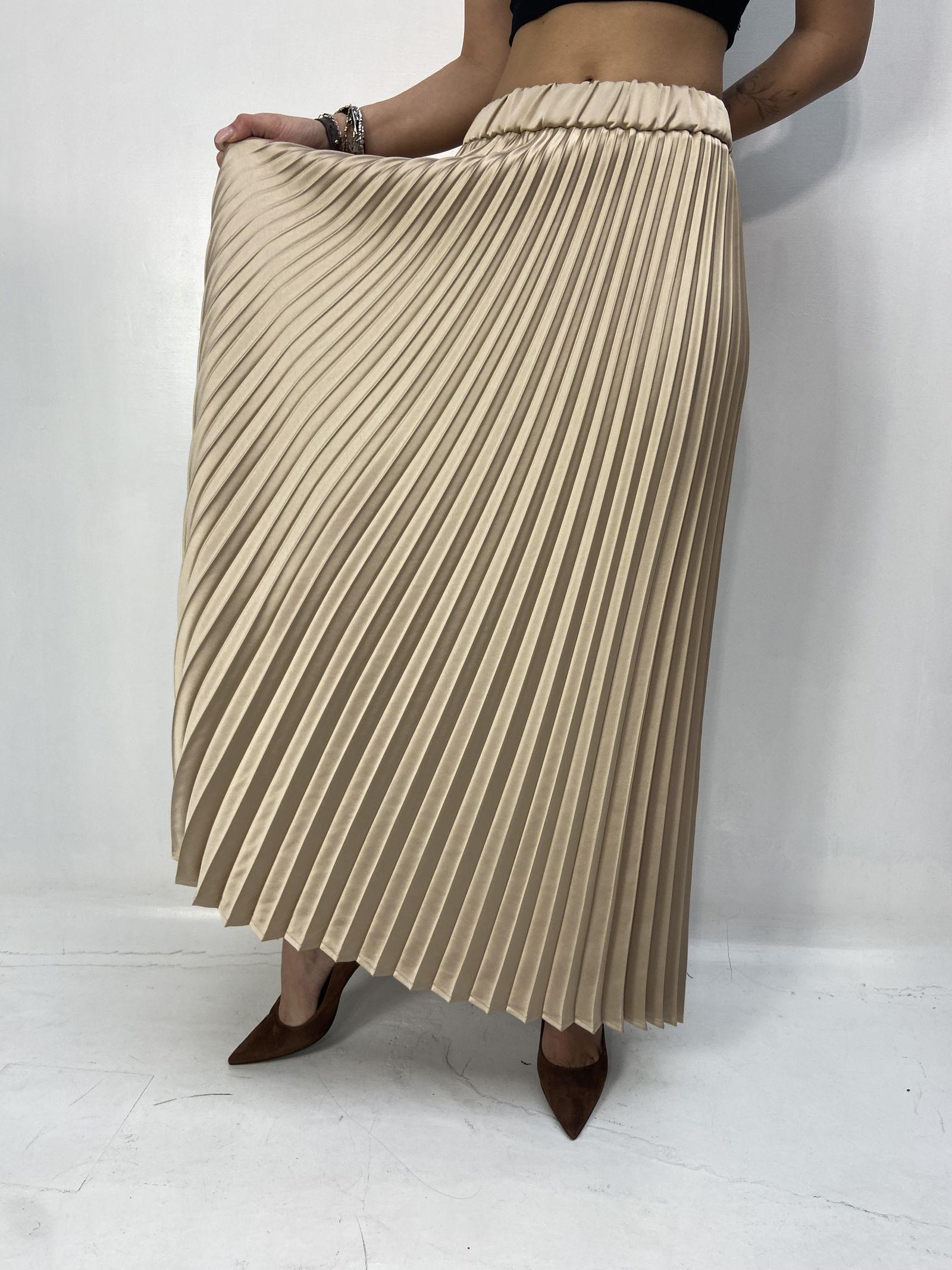 Gonna in raso plissettata dal fascino elegante e senza tempo. Il tessuto fluido e luminoso esalta leffetto dinamico delle pieghe, creando un delicato gioco di movimento e riflessi. La vita con elastico assicura comfort e una vestibilità impeccabile, adattandosi con naturalezza alla silhouette. Leggera e versatile, è il capo ideale per completare look sia casual che più sofisticati, aggiungendo un tocco di femminilità e raffinatezza a ogni occasione.