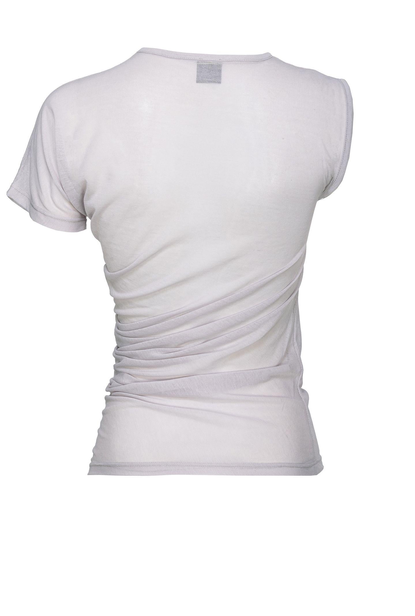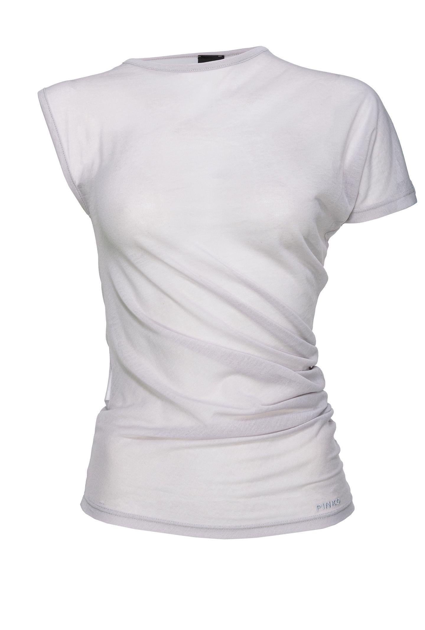 Maglia a maniche corte in leggerissimo jersey crèpe di misto cotone effetto garza, che conferisce al tessuto un aspetto semitrasparente. Il suo volume morbido con scollo rotondo la rende un sottogiacca perfetto da abbinare a completi e tailleur.